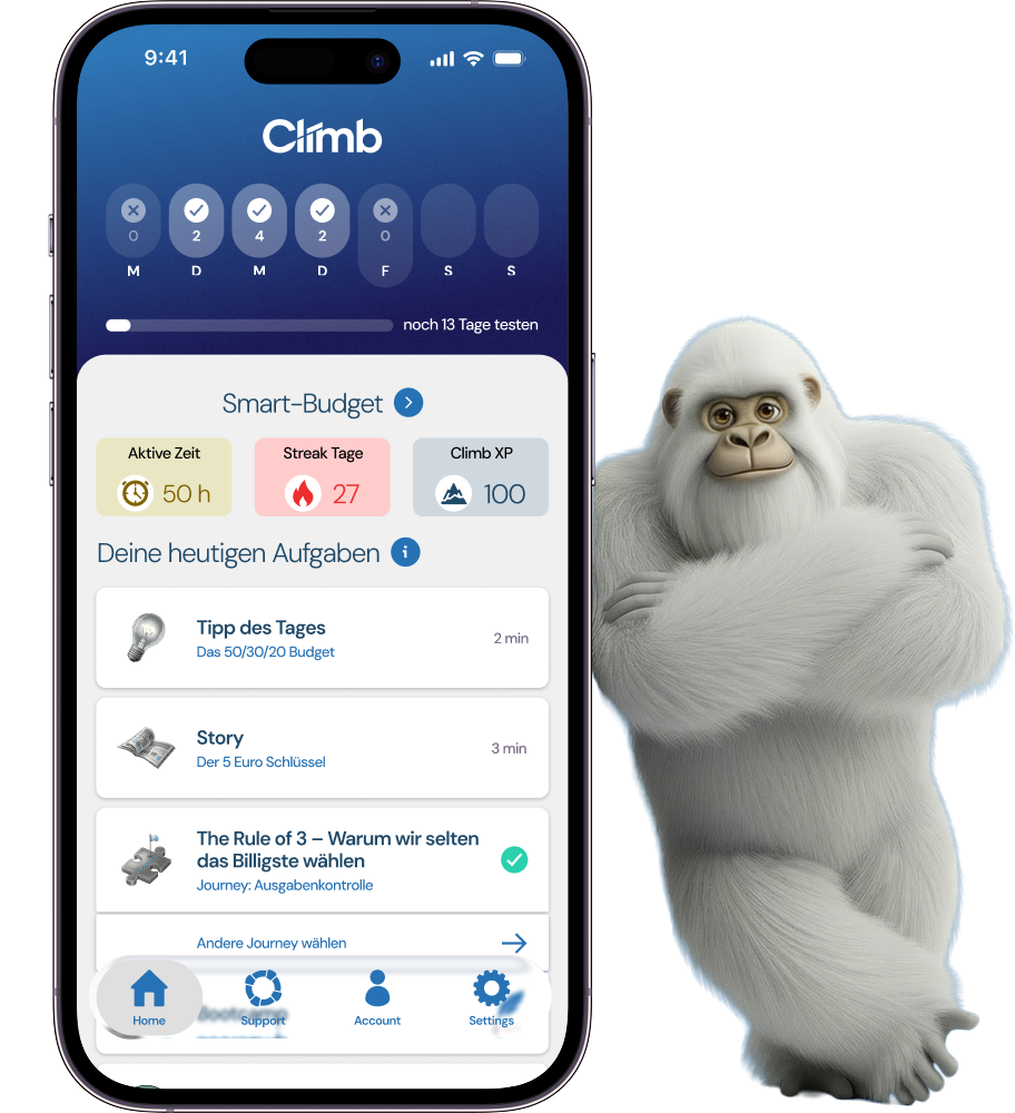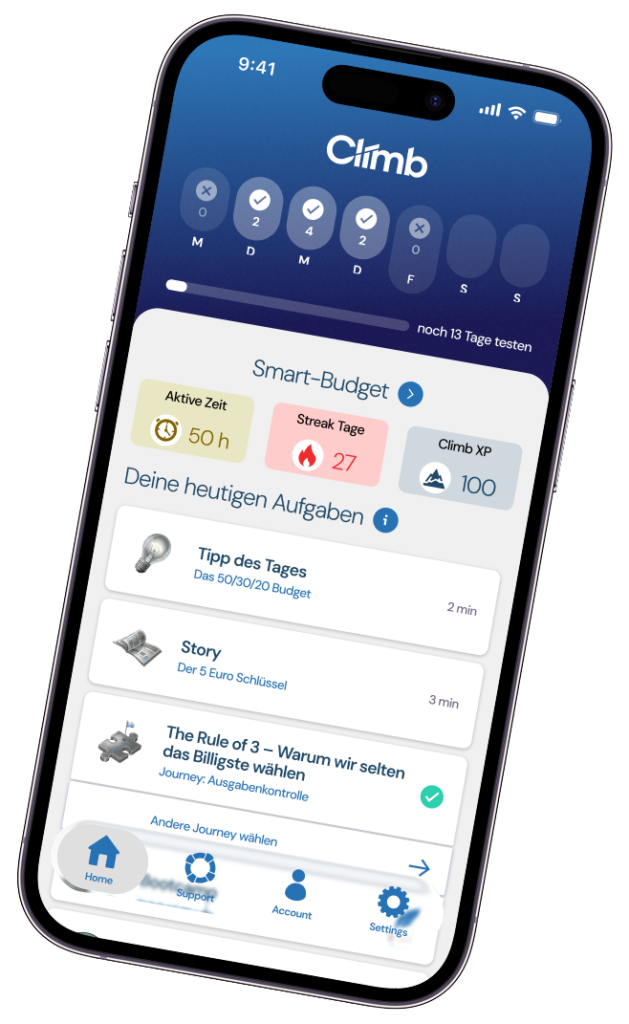 Climb begleitet dich auf deinem Weg, besser mit Geld umzugehen: Verhaltenspsychologisch fundiert, leicht umzusetzen, jeden Tag ein Stückchen besser.